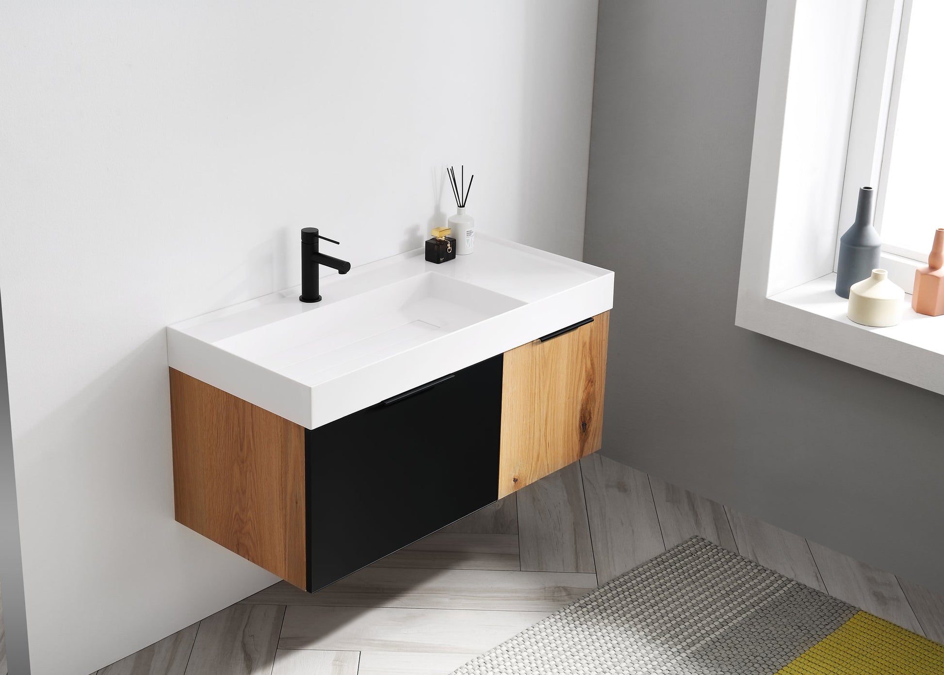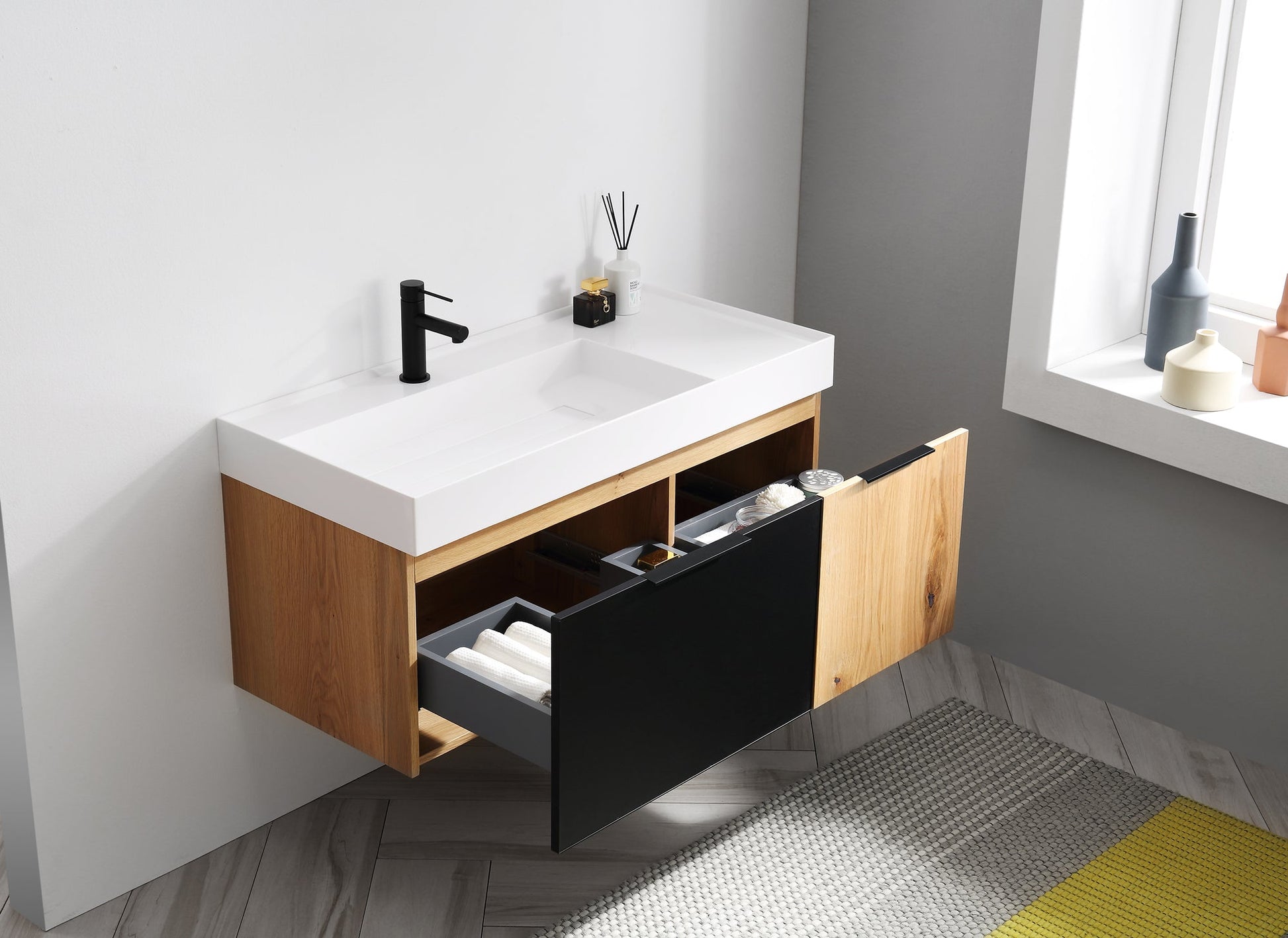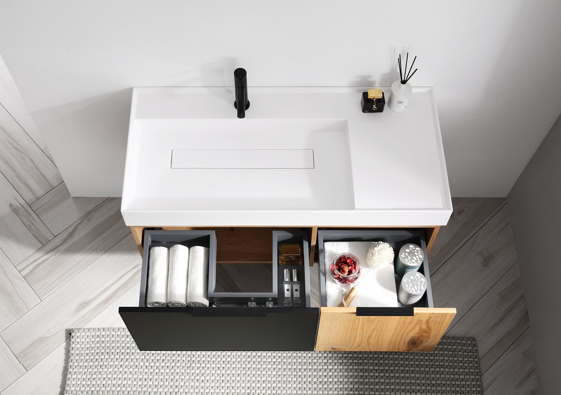 In Lugano 42"/55" collection, the left drawer panel features a frosted black glass surface, while the right drawer panel has the popular maple wood finishing. The side panels and interior of the vanity are made of maple solid wood. The two colors complement each other perfectly, and the design combines modern and traditional elements, making the entire cabinet stand out in the bathroom space. Meanwhile, the acrylic countertop with bullnose edging is one of the highlights of our new product line. It prevents water from spilling off the countertop, making the entire design more convenient and functional.