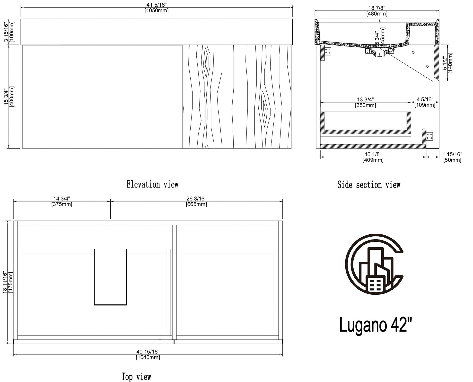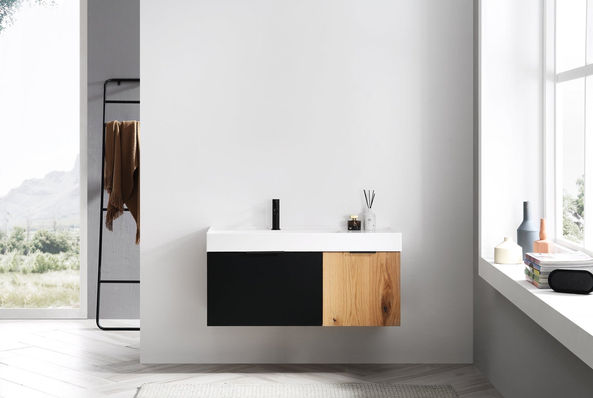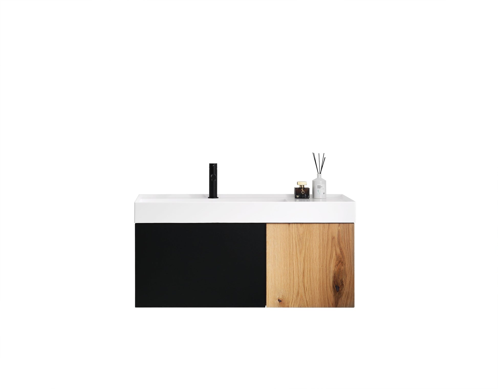 In Lugano 42"/55" collection, the left drawer panel features a frosted black glass surface, while the right drawer panel has the popular maple wood finishing. The side panels and interior of the vanity are made of maple solid wood. The two colors complement each other perfectly, and the design combines modern and traditional elements, making the entire cabinet stand out in the bathroom space. Meanwhile, the acrylic countertop with bullnose edging is one of the highlights of our new product line. It prevents water from spilling off the countertop, making the entire design more convenient and functional.