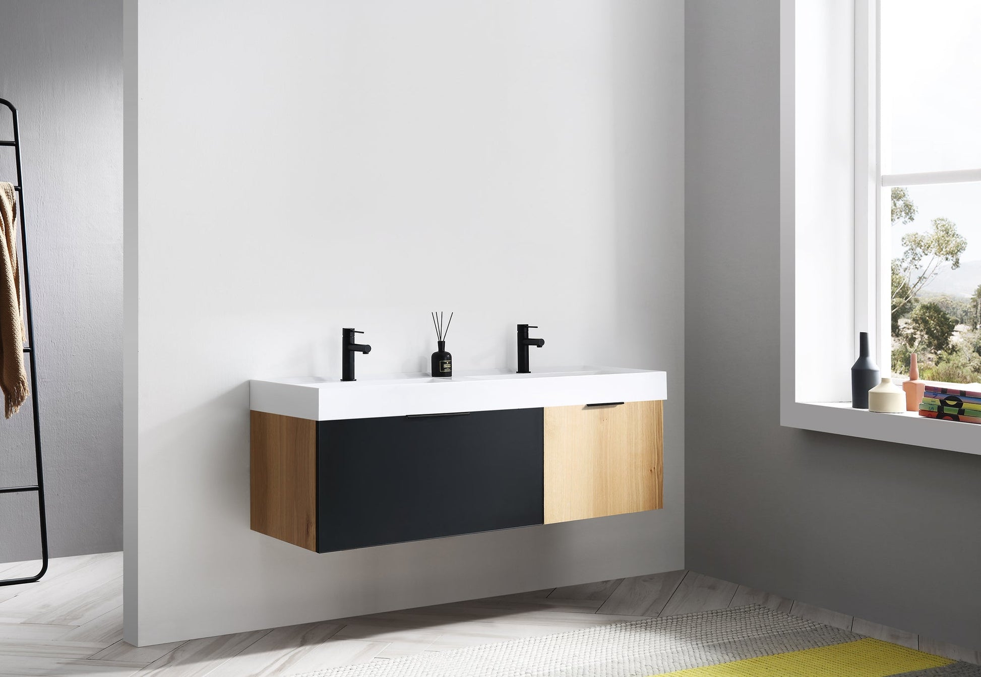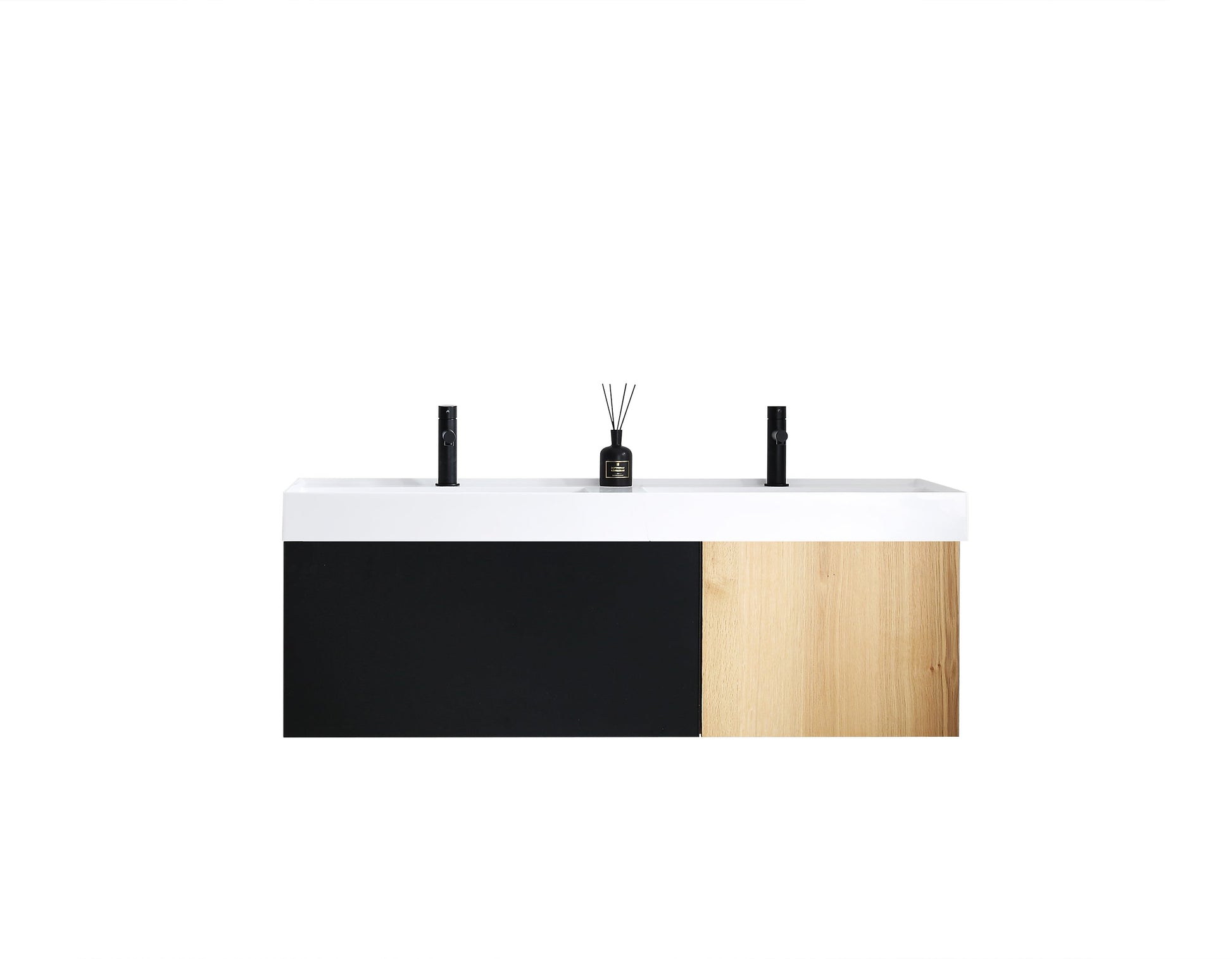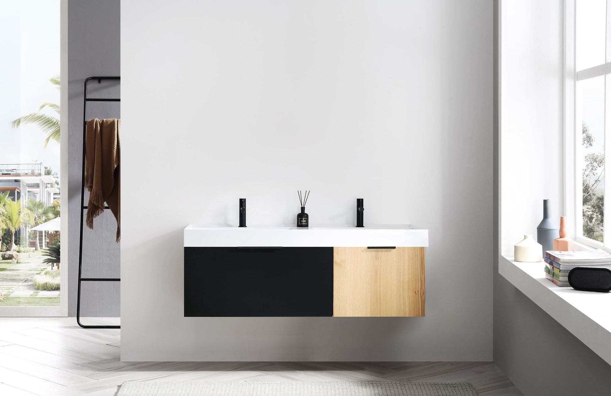 LUGANO 55” MATTE BLACK GLASS/MAPLE WALL MOUNT MODERN BATHROOM VANITY