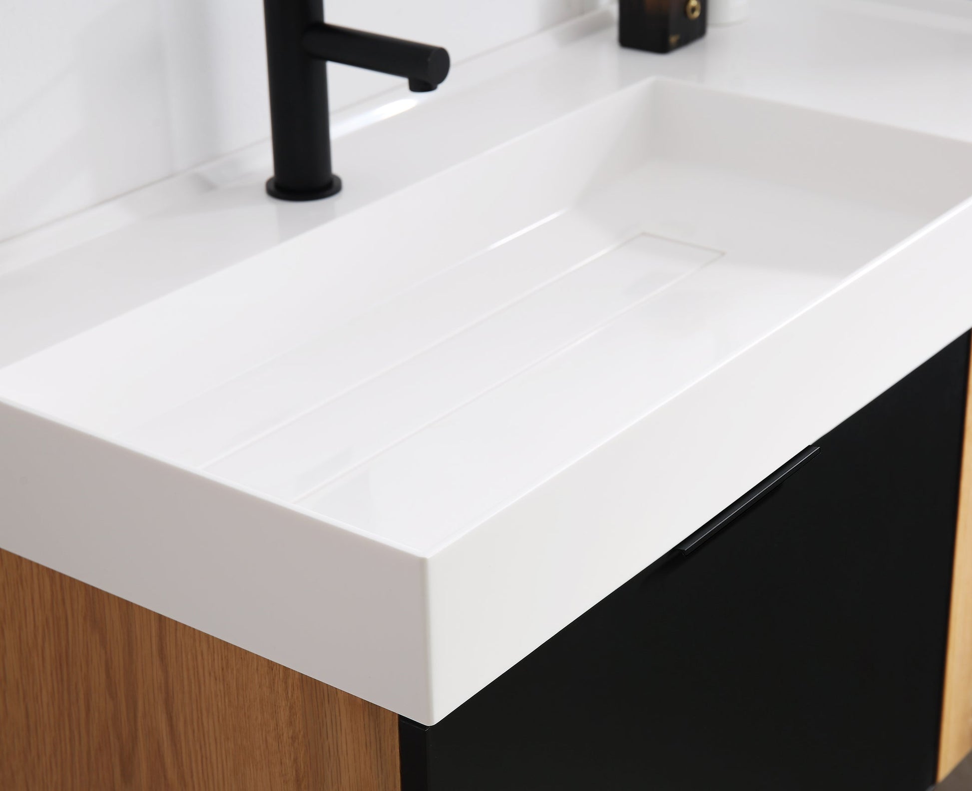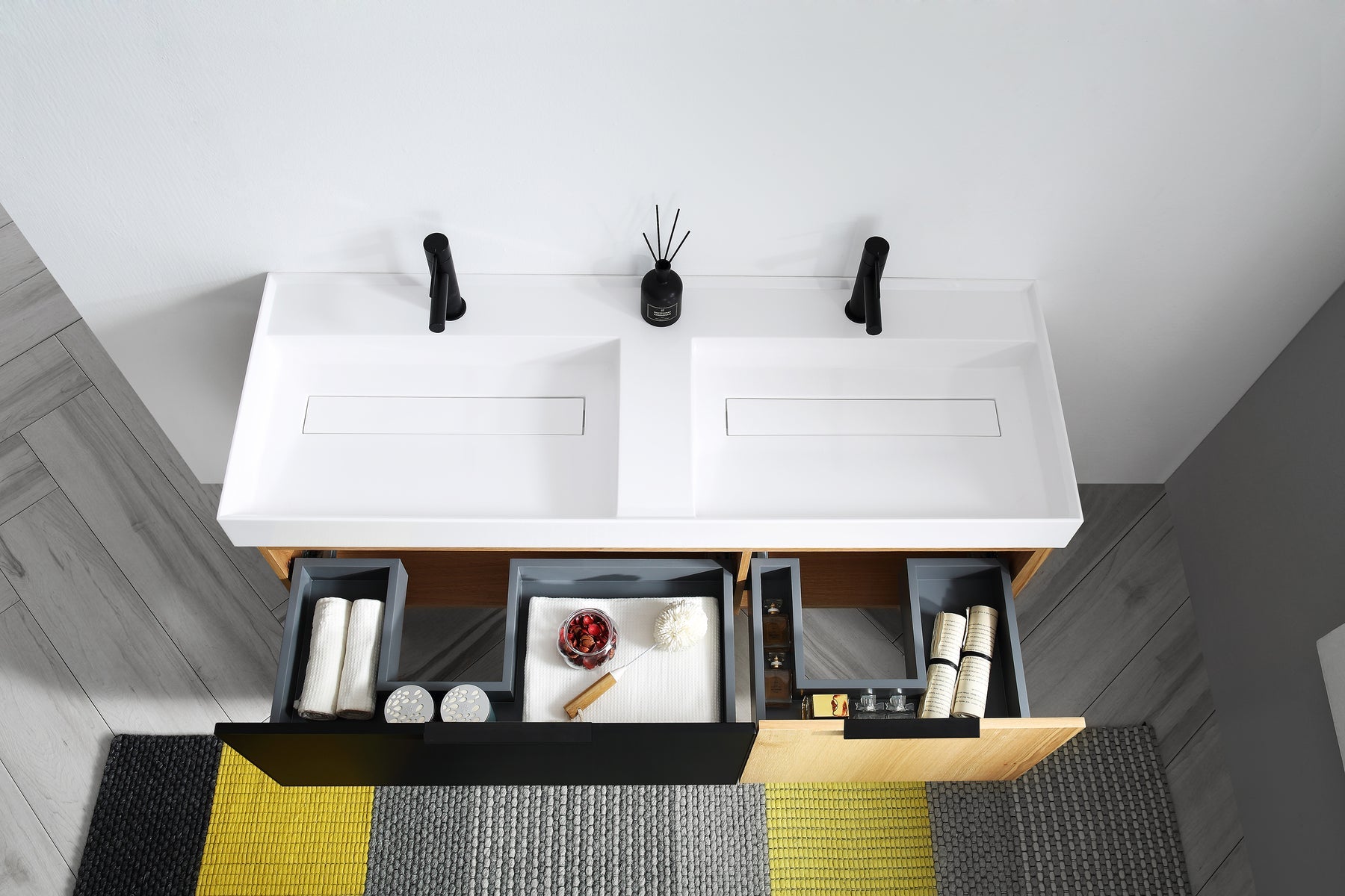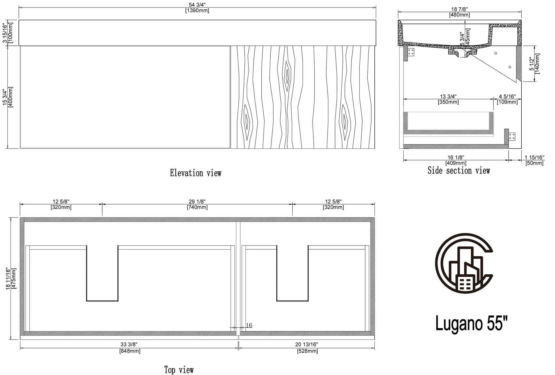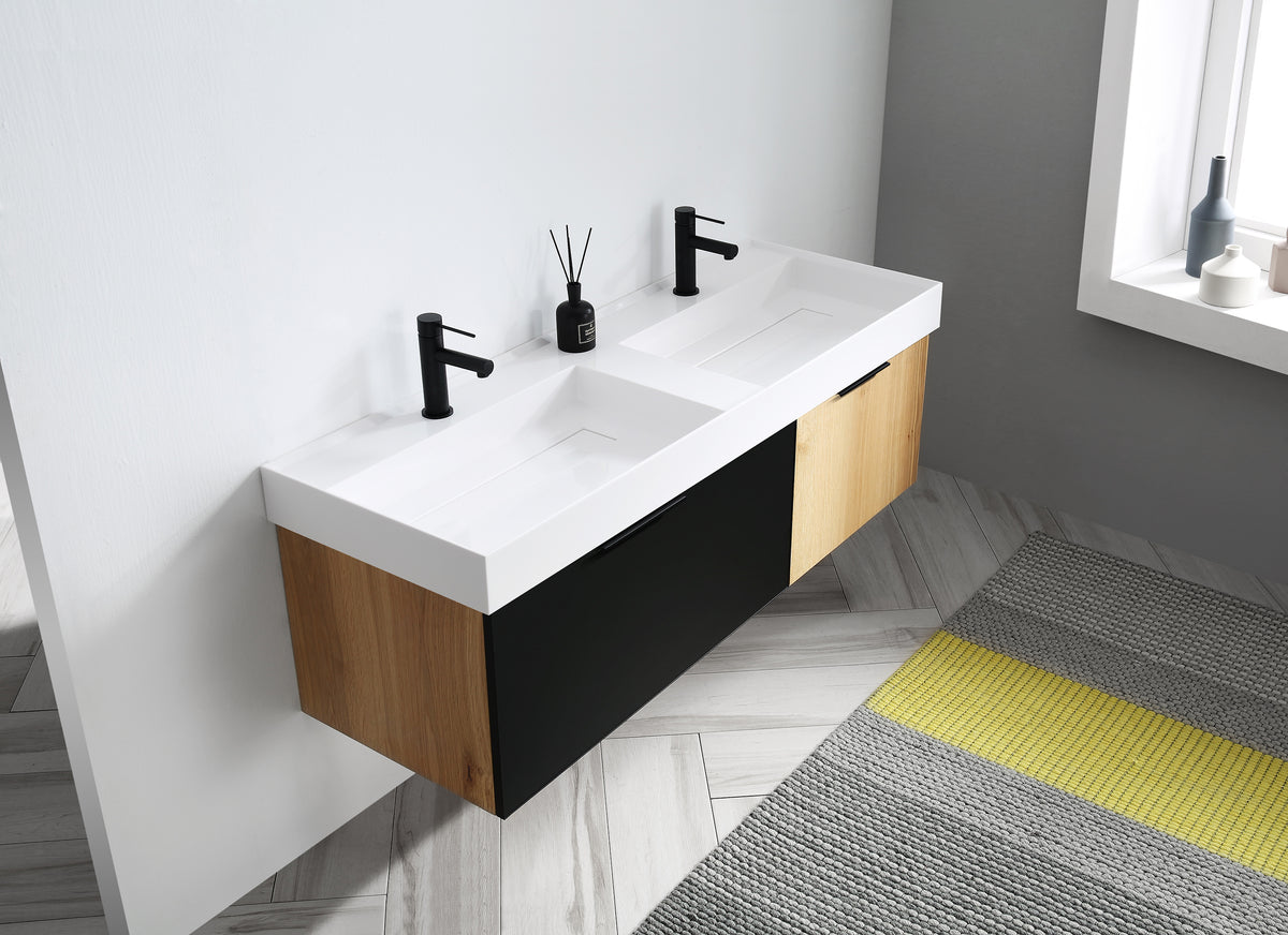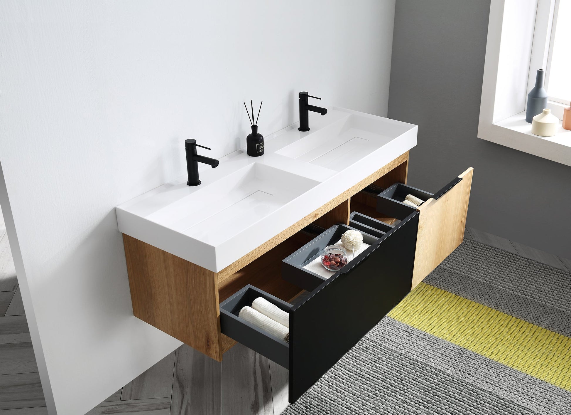 In Lugano 42"/55" collection, the left drawer panel features a frosted black glass surface, while the right drawer panel has the popular maple wood finishing. The side panels and interior of the vanity are made of maple solid wood. The two colors complement each other perfectly, and the design combines modern and traditional elements, making the entire cabinet stand out in the bathroom space. Meanwhile, the acrylic countertop with bullnose edging is one of the highlights of our new product line. It prevents water from spilling off the countertop, making the entire design more convenient and functional.