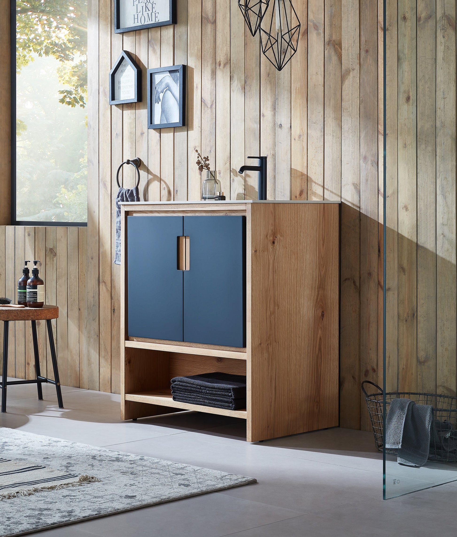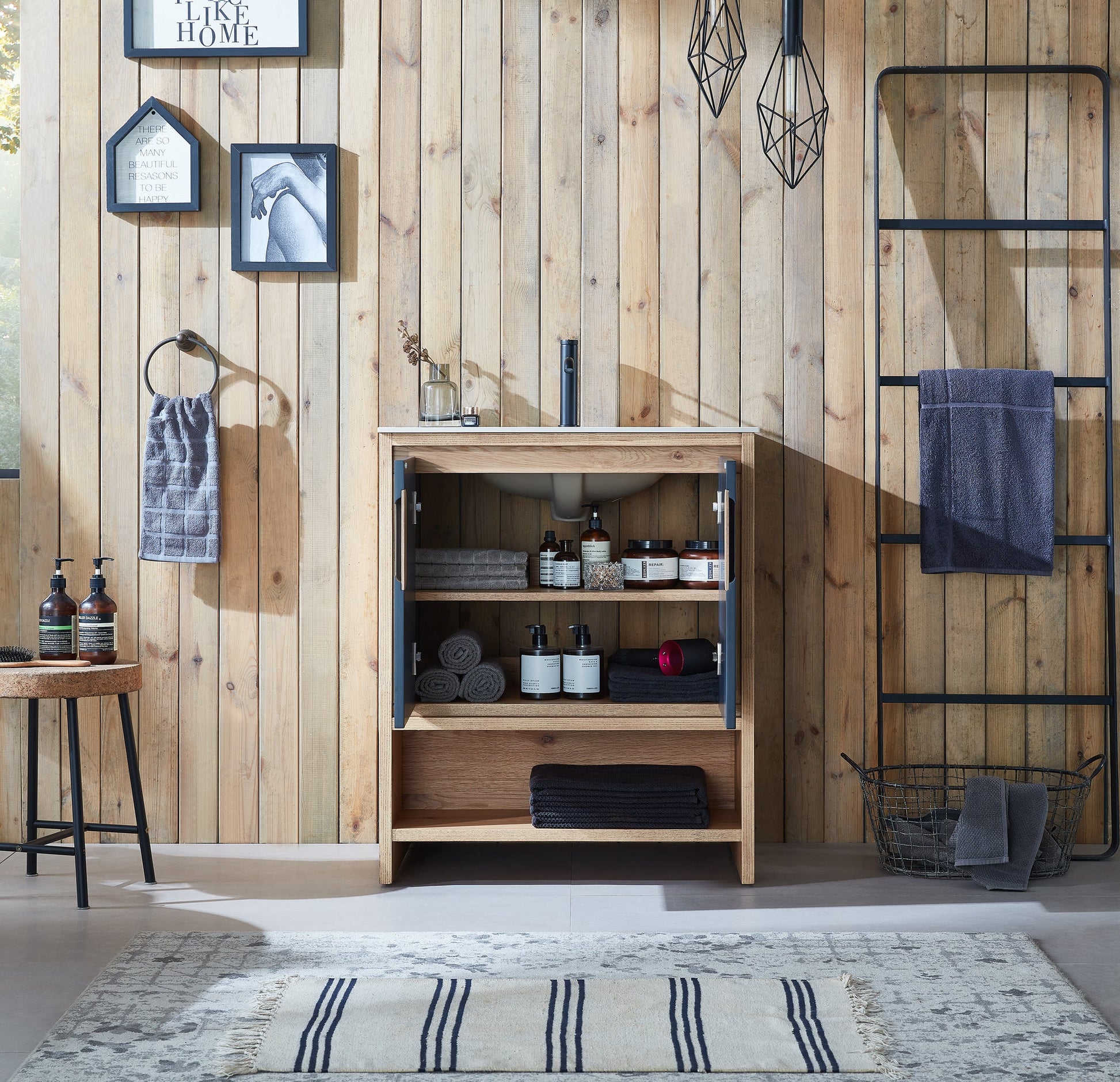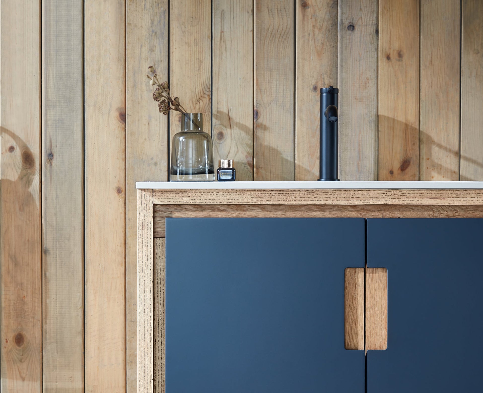 Front of Bathroom Cabinets: BLACK OF NIGHT/MAPLE