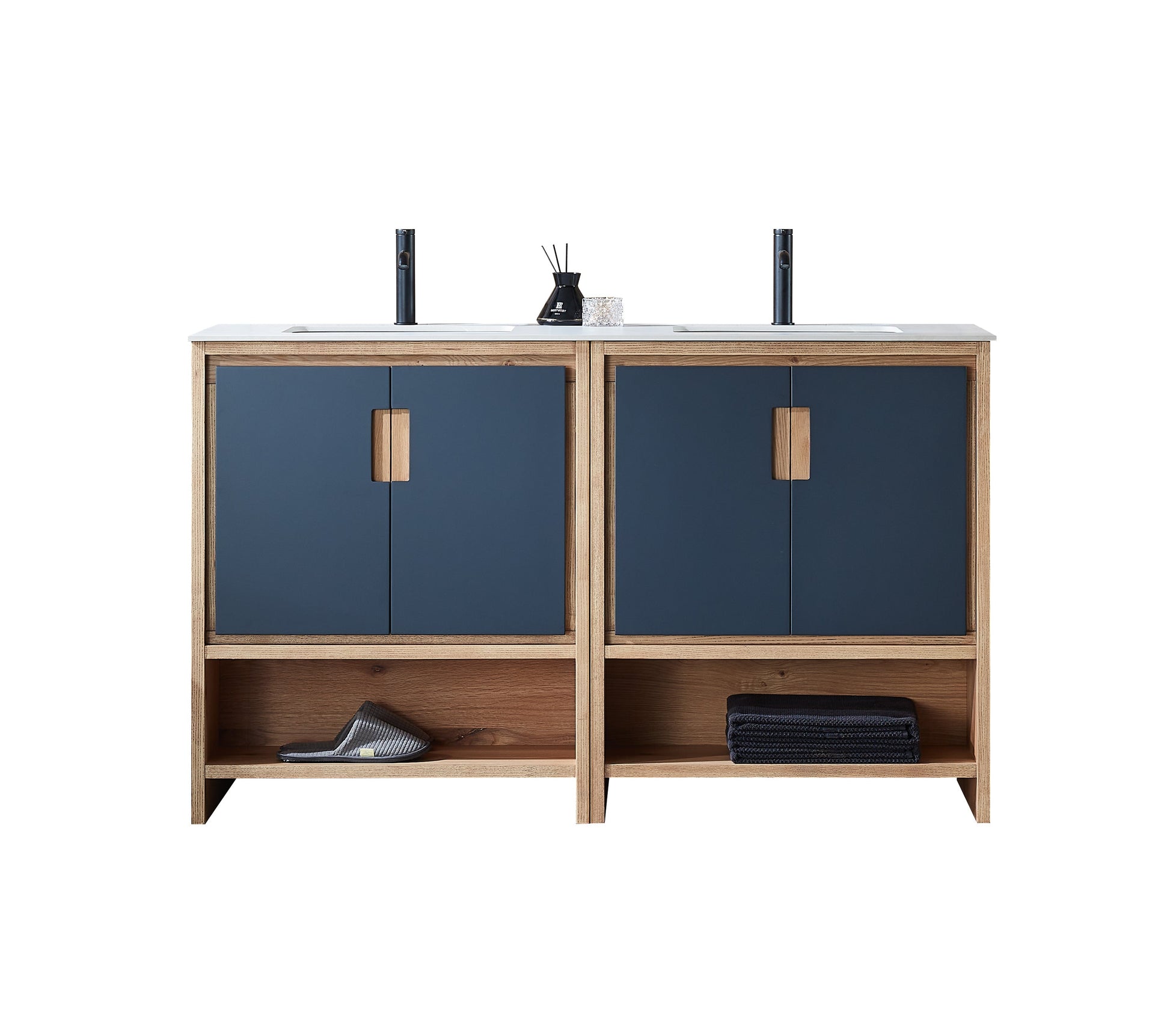 LYON 60” BLACK OF NIGHT/MAPLE MODERN FREESTANDING BATHROOM VANITY (WHITE COUNTERTOP)