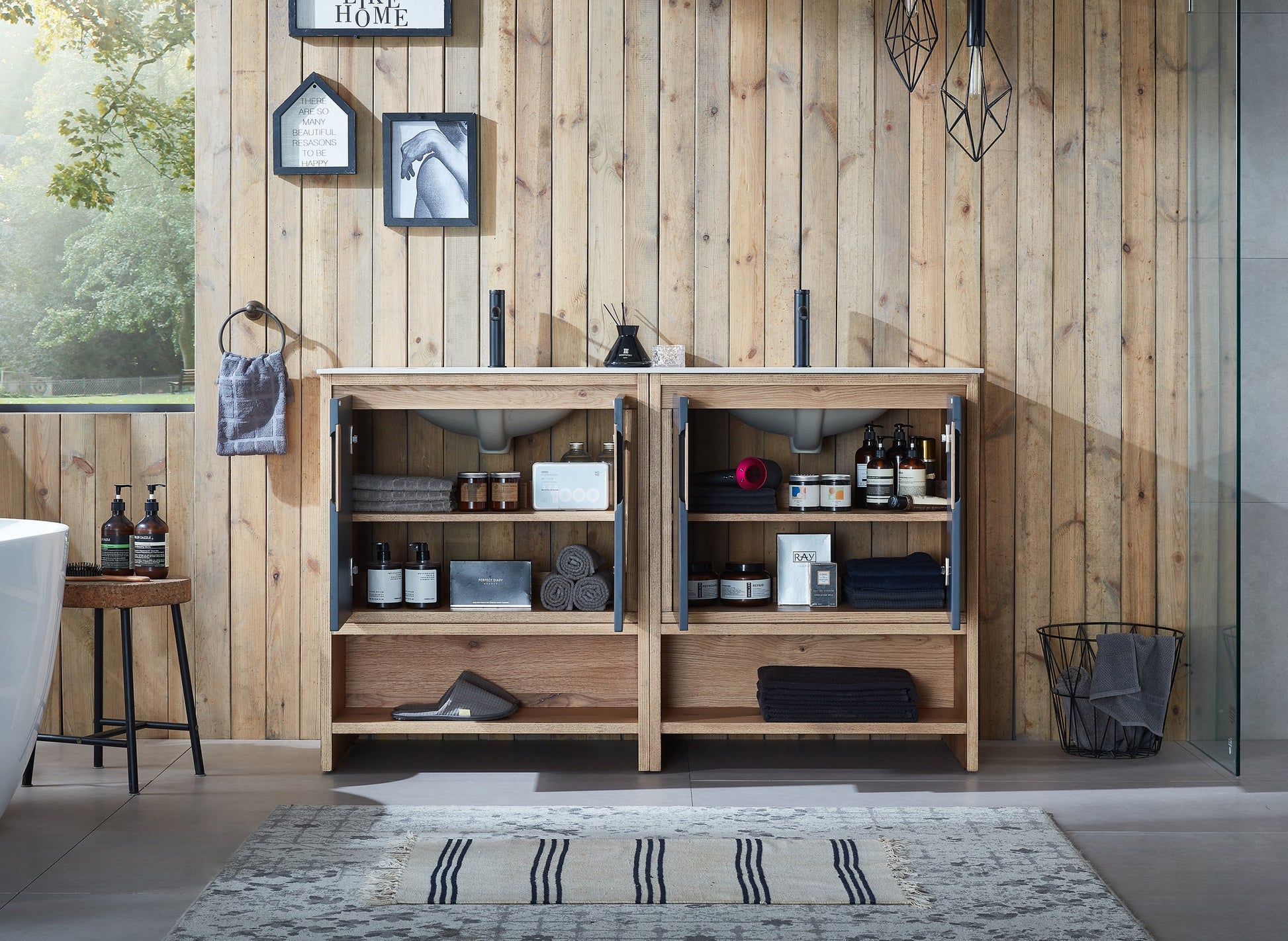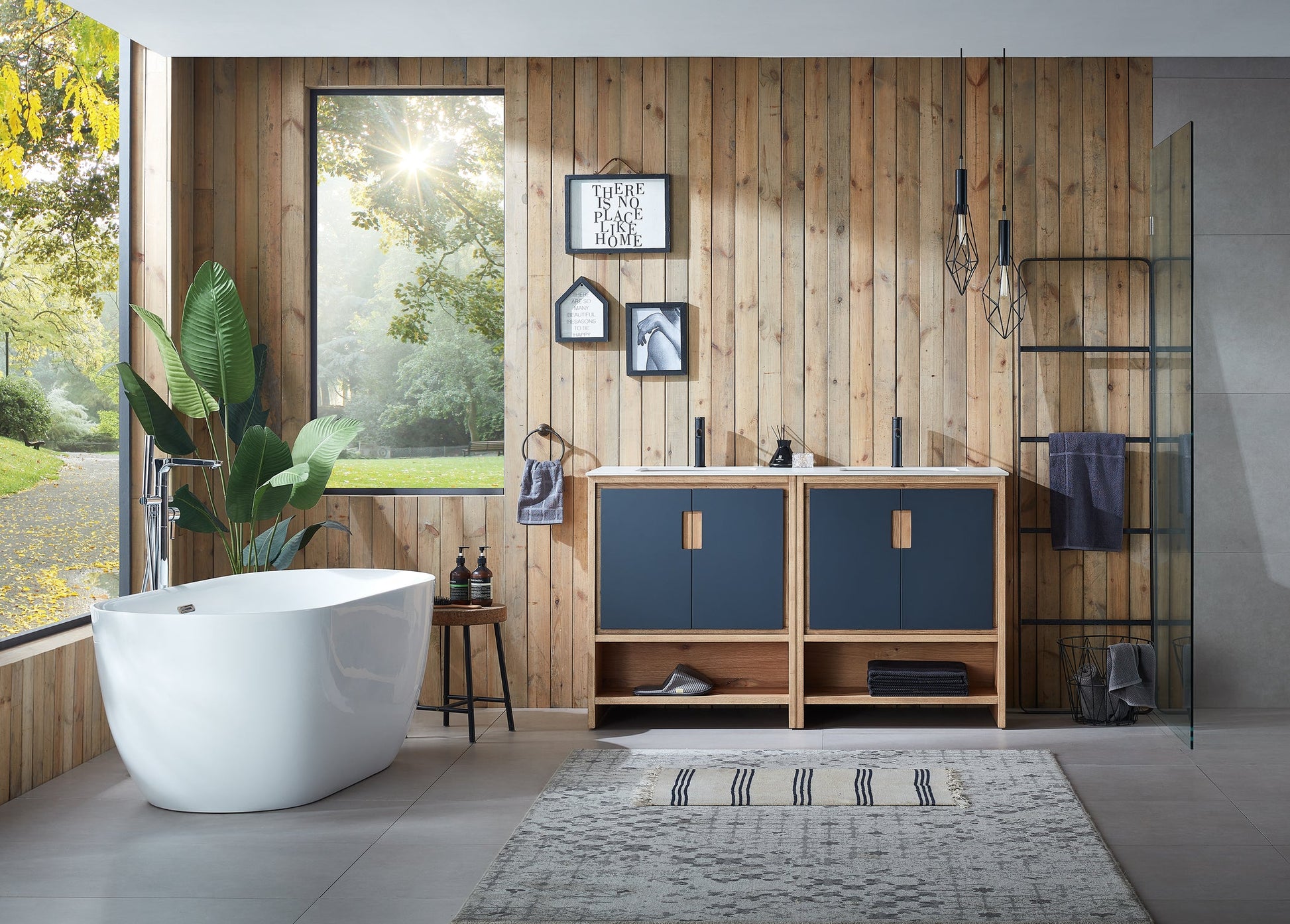 The newest entry in Cartisan’s catalog of vanities is our elegant and warm Lyon series. Available in 60”/30”, Black of Night/Maple and Beige/Walnut, Lyon is the perfect balance of rustic and contemporary. Its pleasant organic wood paneling is paired with Valspar-coated doors and a cool, sleek countertop. This premium white/black sintered stone counter features ceramic undermount sinks. Concave design, which shapes the unique handles and door edges, brings out stereoscopic appearance to the front. Double cabinet doors open to reveal multiple shelves, in addition to an open bottom shelf for storage. Black of Night and Beige are both in 2023-2024 best color collections for designers.