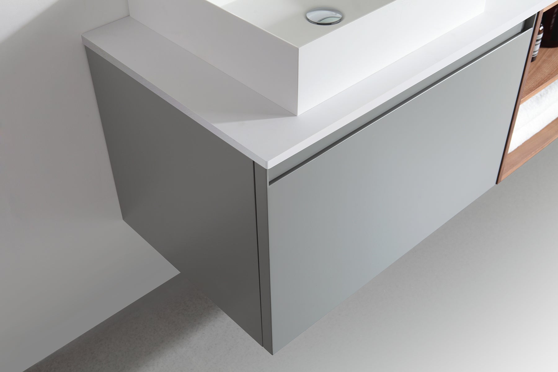 Manarola 42"/72" open shelves, available in Light Gray, combines contemporary style and engaging texture to create a high quality bath experience. Modern angles characterize this wall mounted piece boasting handleless drawer(s) and two walnut open shelves to store your essentials in style. A pure white countertop with vessel sink(s) is made by premium solid surface. Cartisan Design transforms contemporary trends by blending simplicity, comfort, and luxury with elegantly smooth surfaces and lines.
