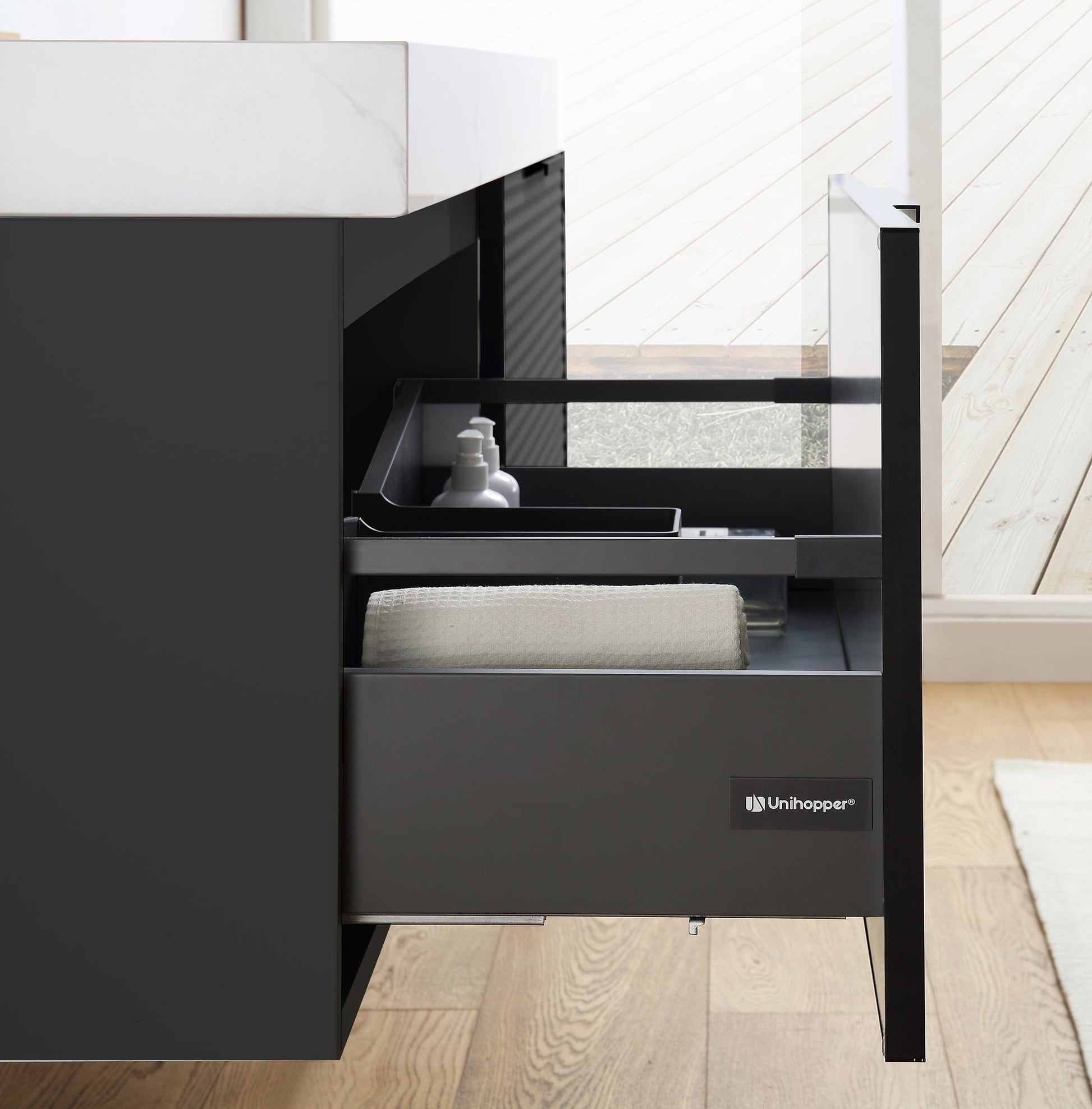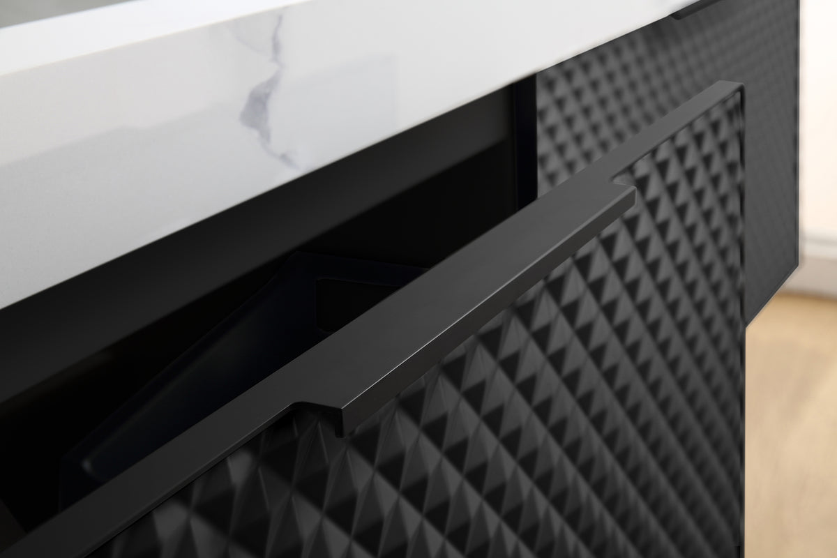 We're excited to introduce a revamped version of one of our bestselling items - the Manarola collection. Manarola 48"/60"/72", available in Black of Night and Silver Gray, features the drawer surface with unique geometric pattern, adding texture and dimension to this elegantly designed piece. Two spacious, soft-closing drawers open to reveal ample storage space for your bath essentials. Minimalist handles, smooth metal frame, and a thick, luxurious countertop with beautiful pattern, all add up the perfect finishing touches.