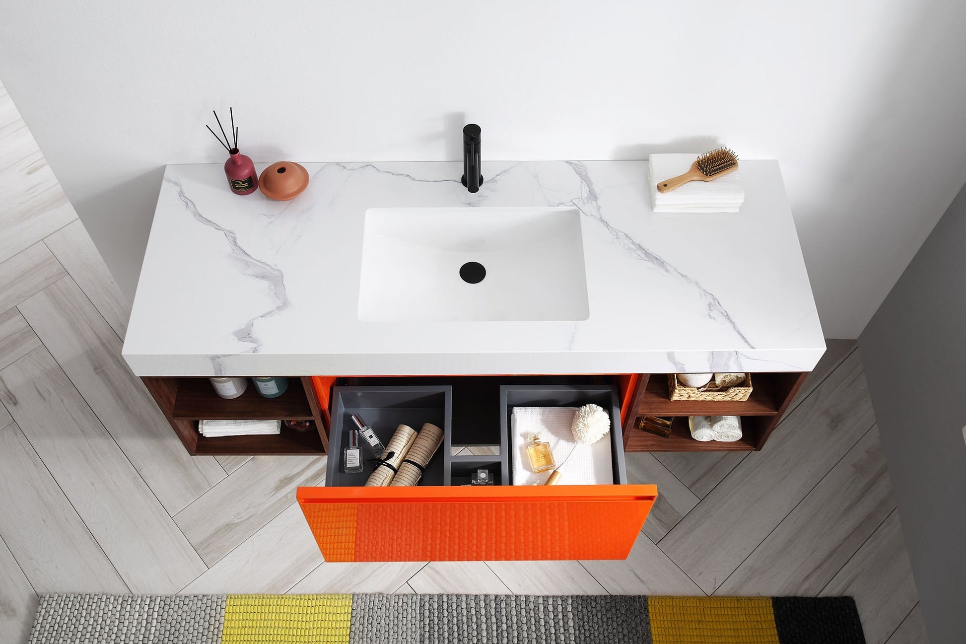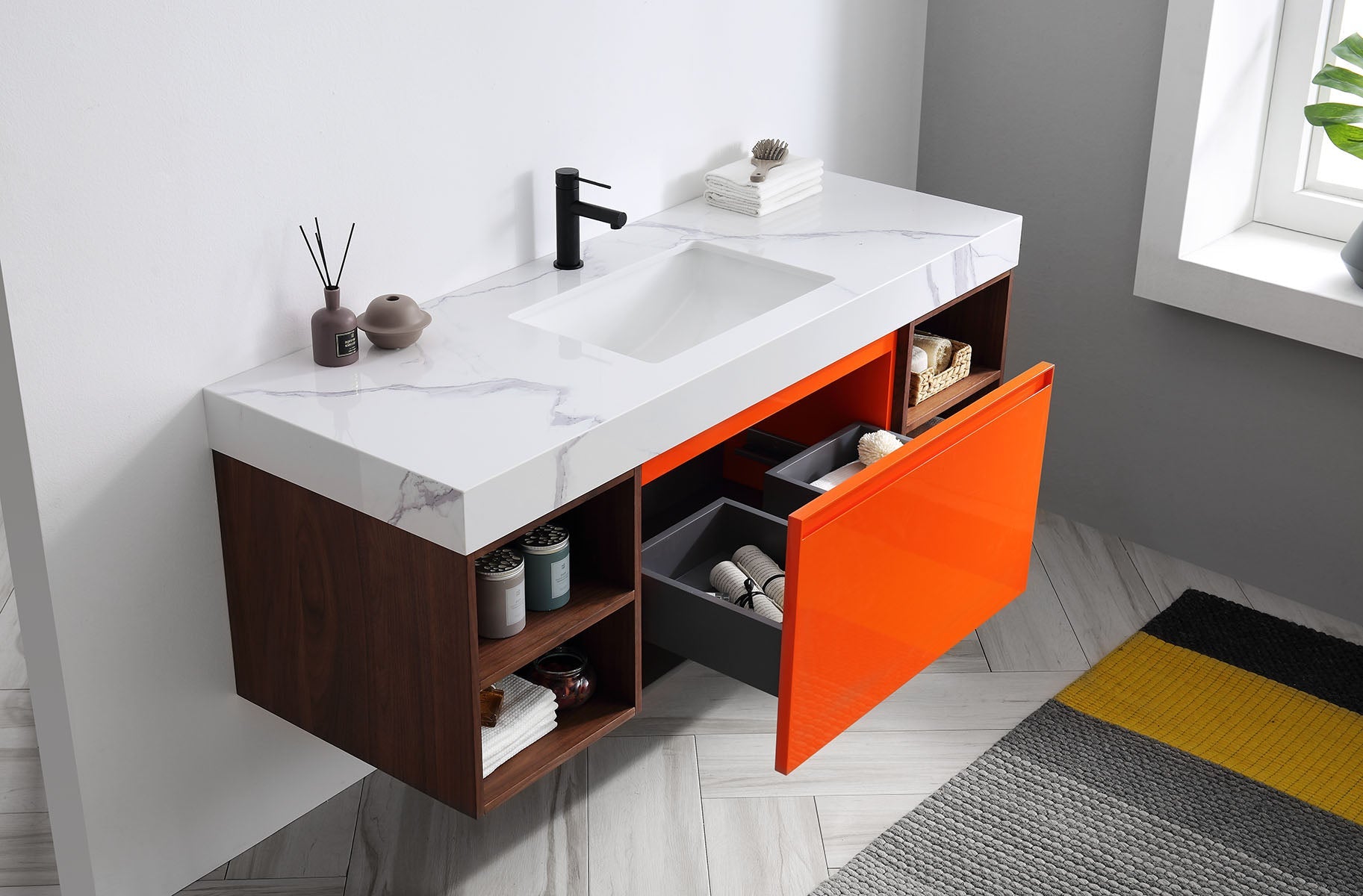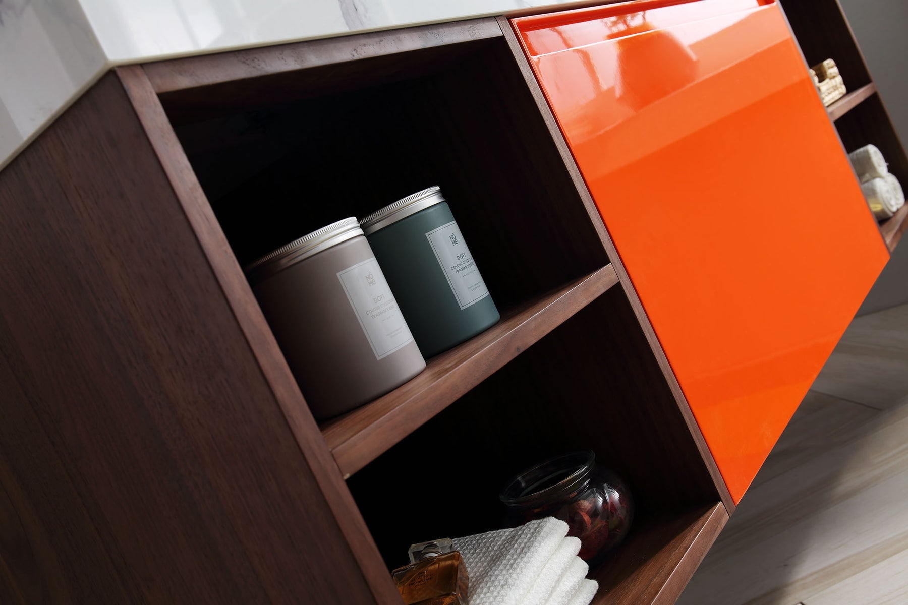 Manarola 42"/60" open shelves, available in Red Amber and Matte Black, boasts handleless drawer to store your essentials in style, finished off with attractive Walnut/Matte White shelving. A thick, luxurious countertop with beautiful pattern brings simple but high-end elegance to your bathroom space. The whole vanity gives its users a feel of warm, contemporary sophistication.