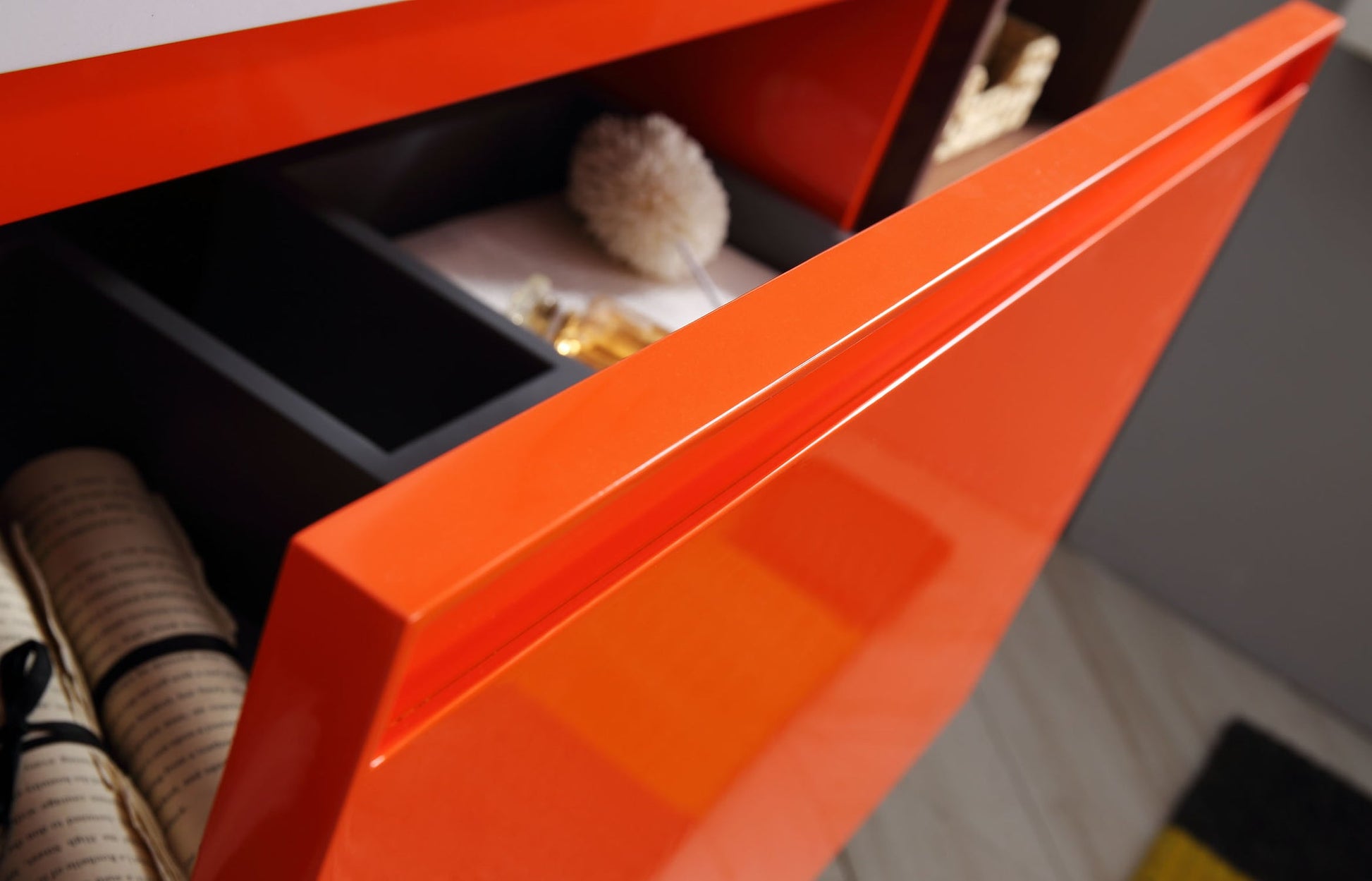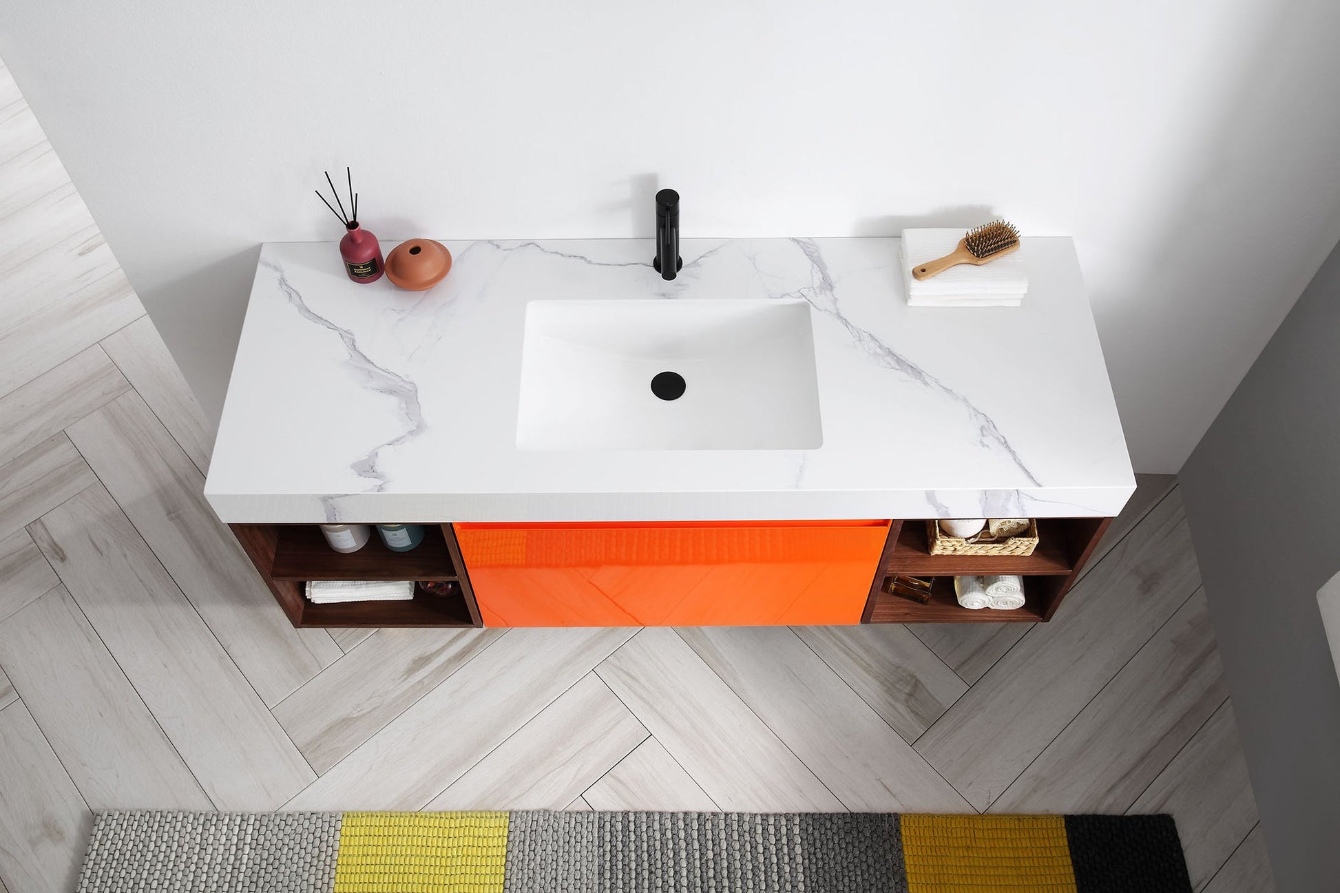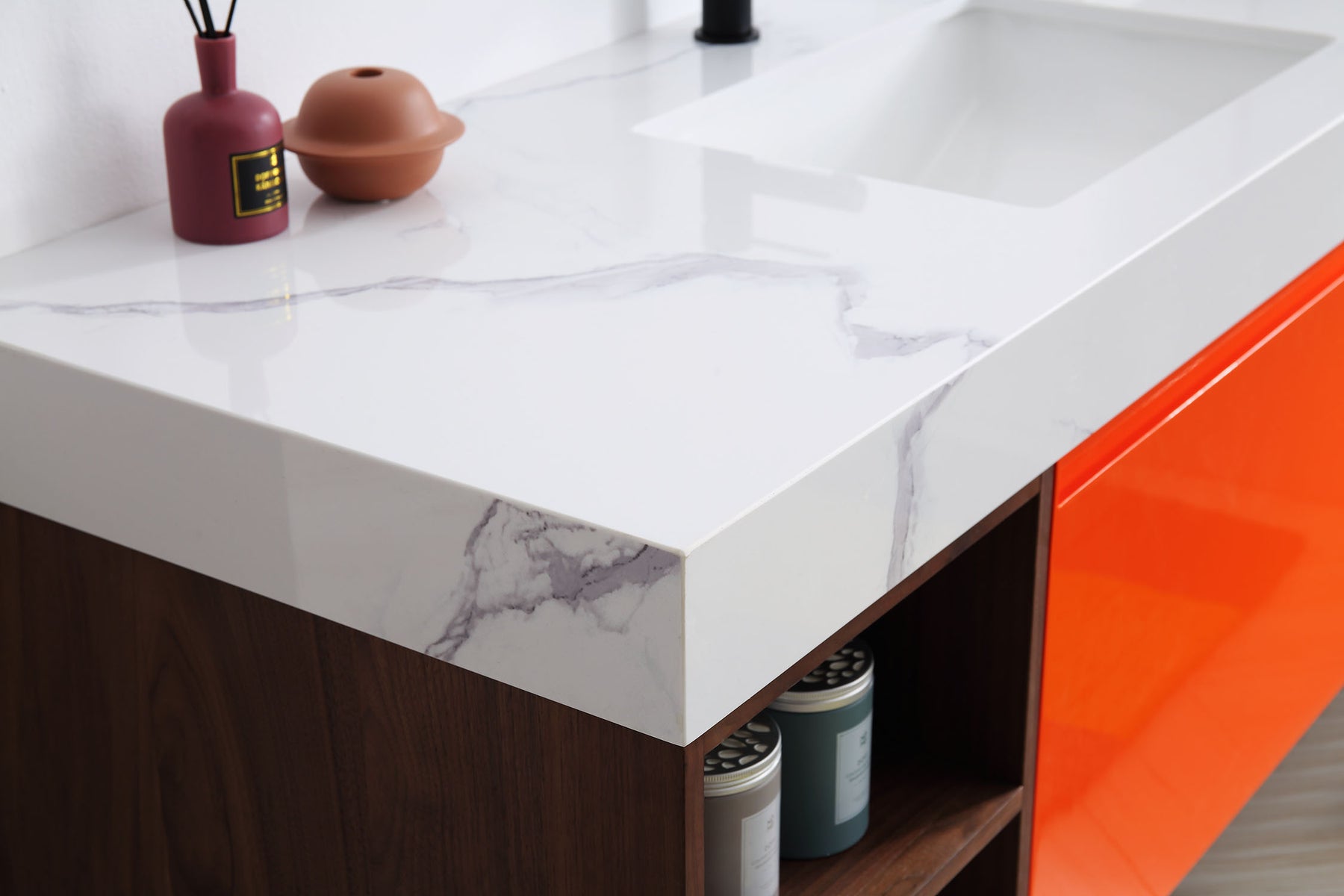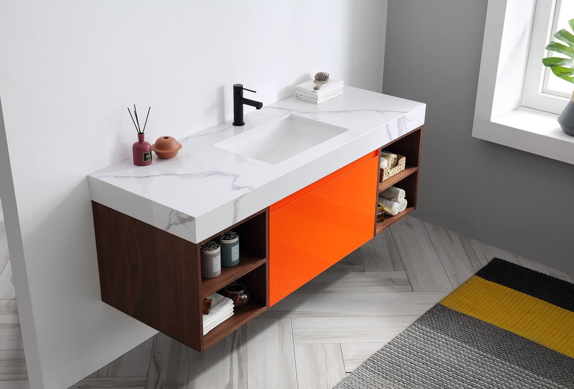 Manarola 42"/60" open shelves, available in Red Amber and Matte Black, boasts handleless drawer to store your essentials in style, finished off with attractive Walnut/Matte White shelving. A thick, luxurious countertop with beautiful pattern brings simple but high-end elegance to your bathroom space. The whole vanity gives its users a feel of warm, contemporary sophistication.