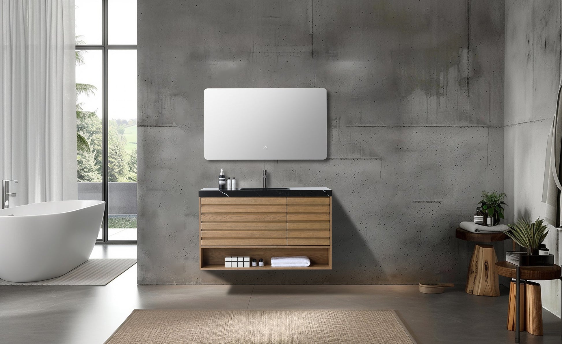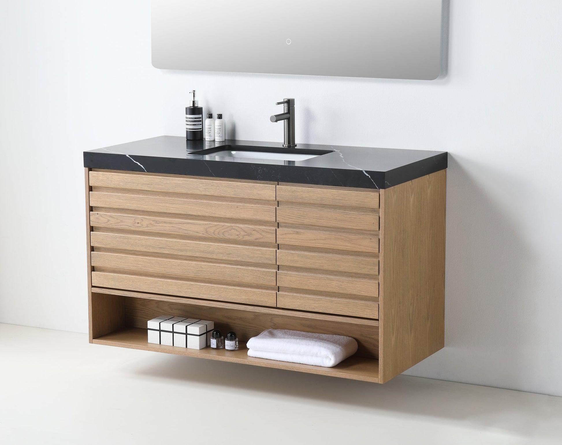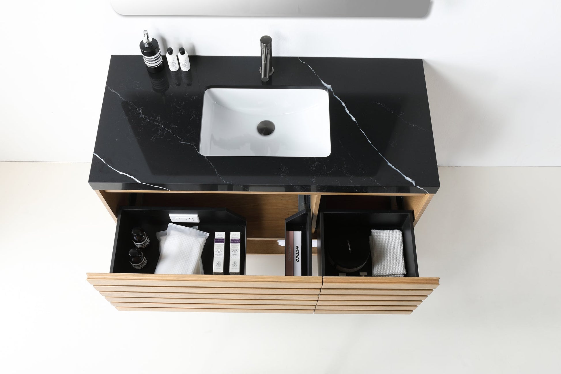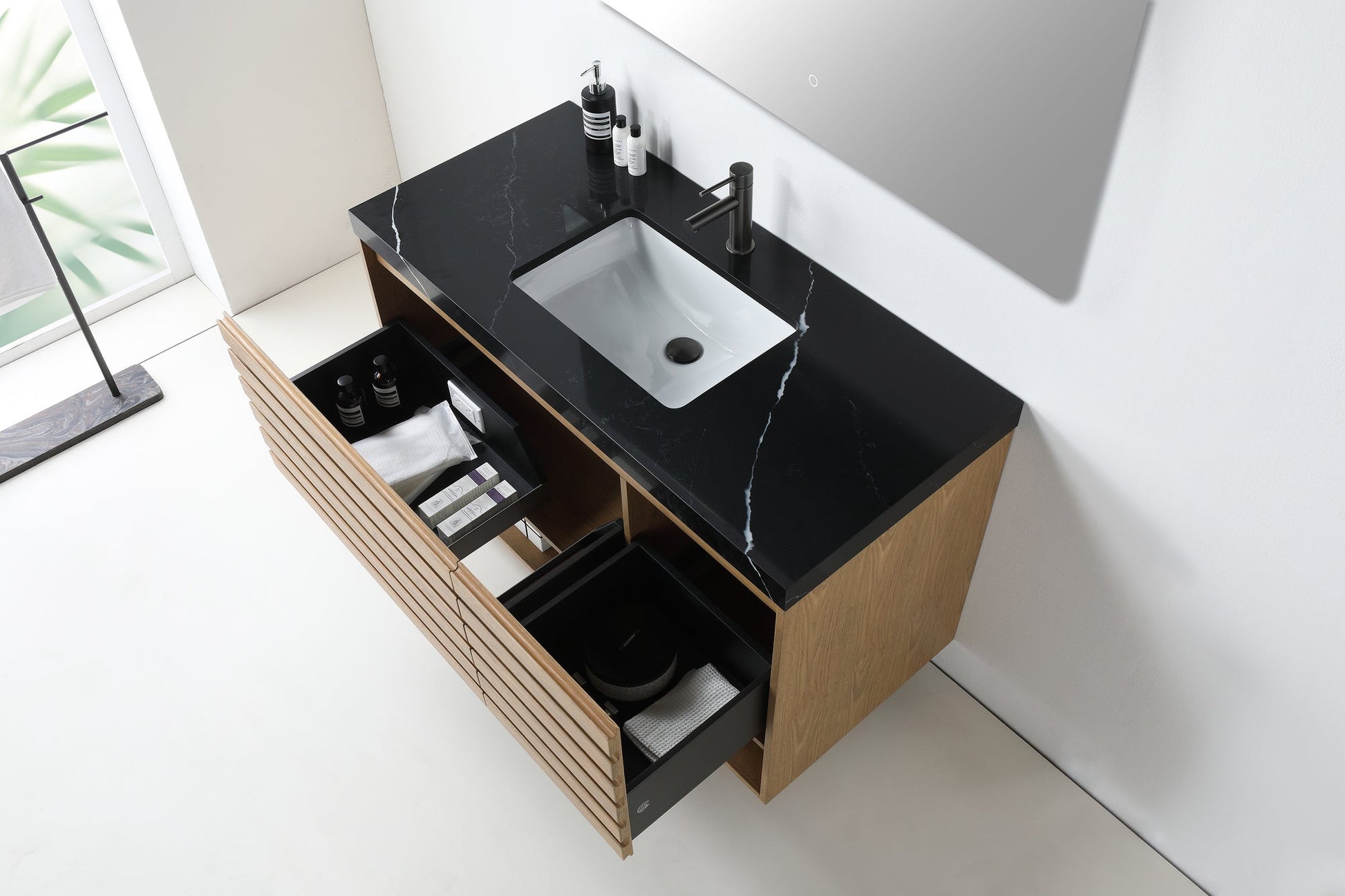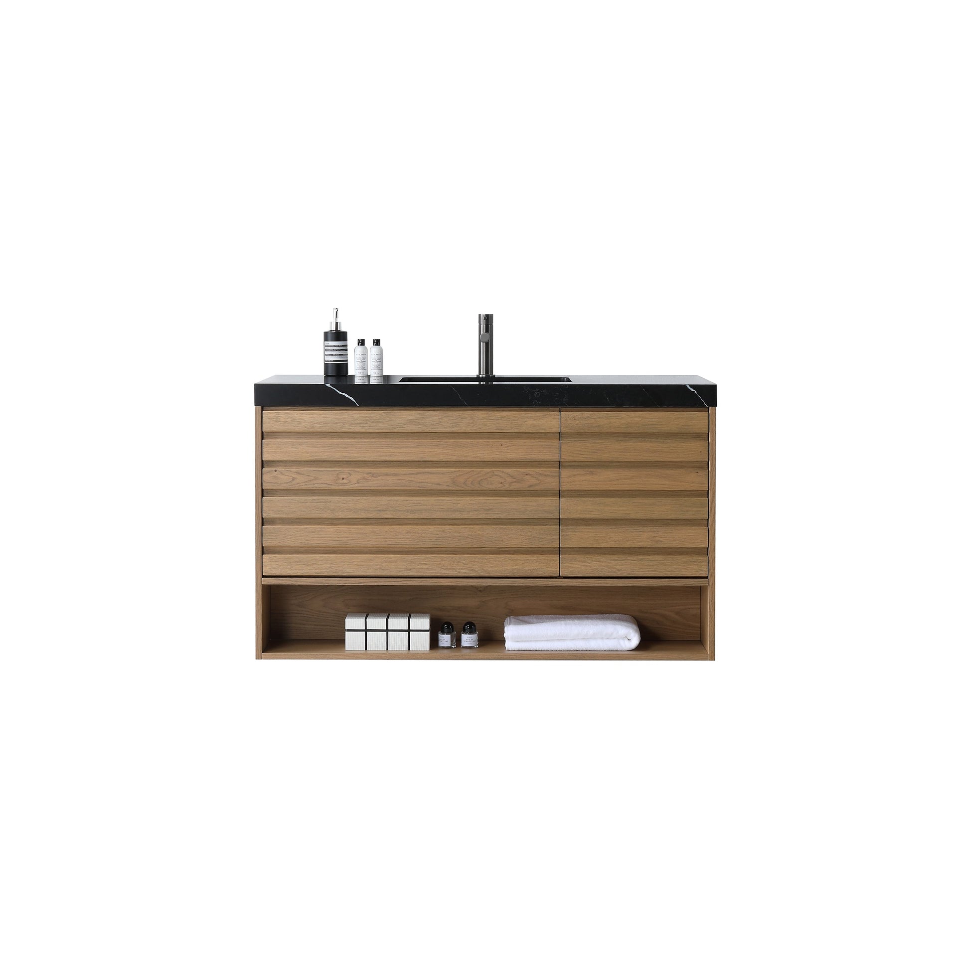 MATERA 48” PECAN OAK WALL MOUNT MODERN BATHROOM VANITY (BLACK COUNTERTOP)