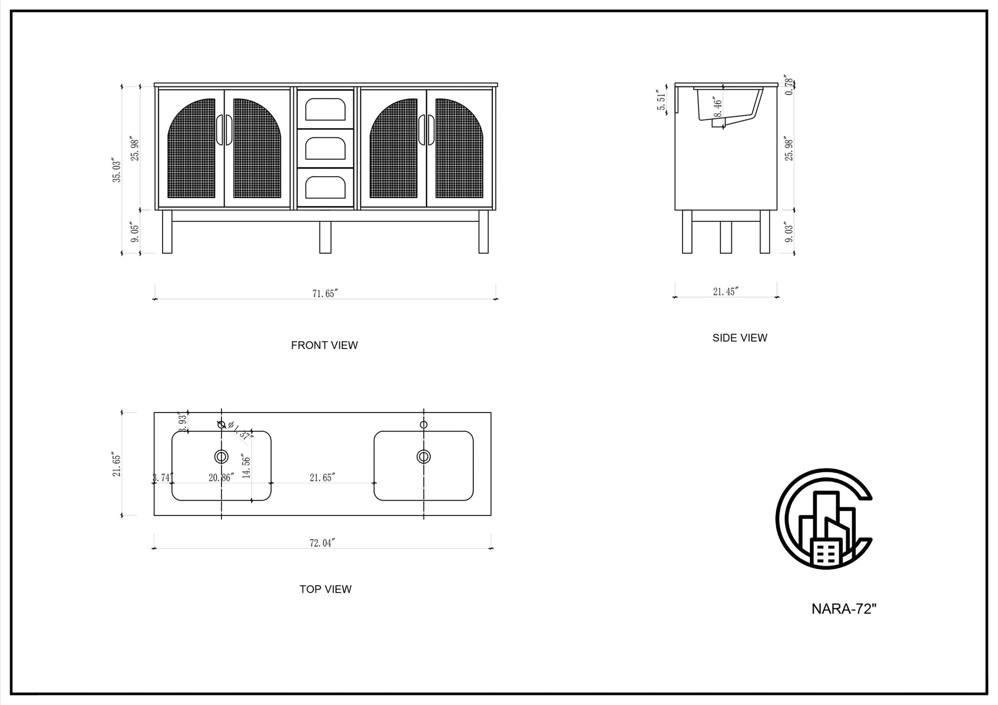 Cabinet: 71.65”W x 21.45”D x 35.03”H