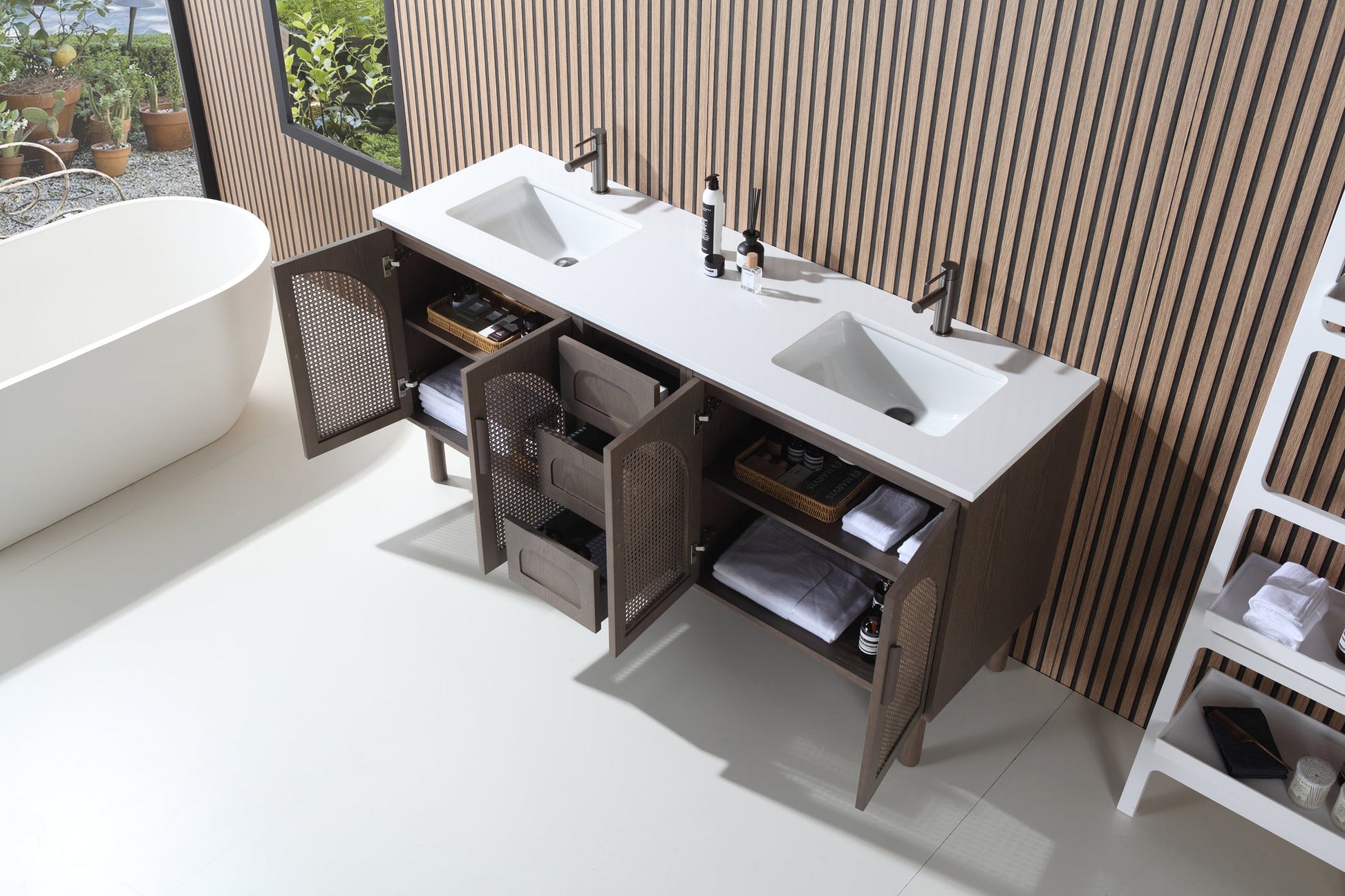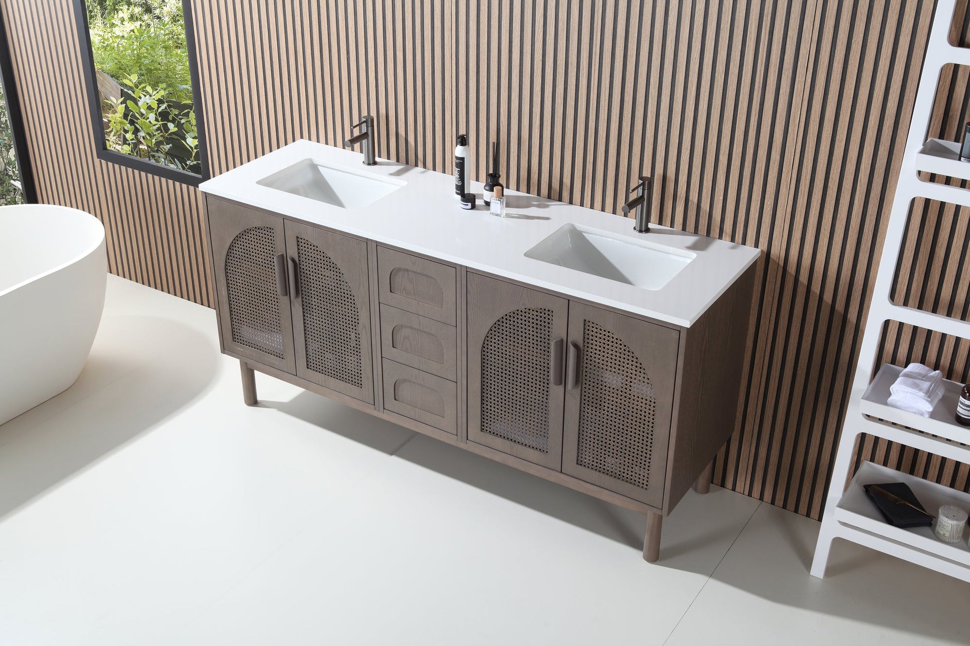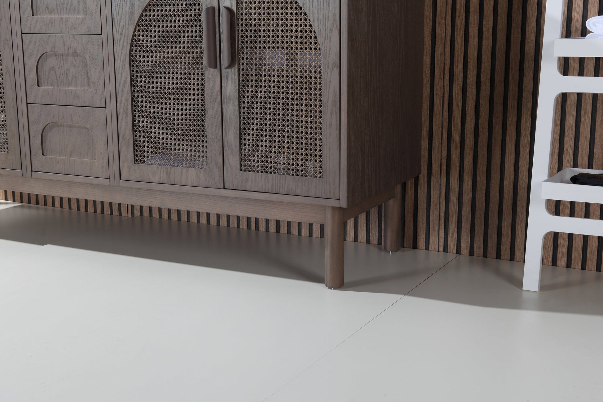 New for 2023-2024, Cartisan Design is pleased to introduce the Mid-century Nara series of vanities. Available in 30”/48"/60"/72", Nara is a perfect blend of classic and organic styles. Pecan oak and Chestnut oak, Nara's two color options, are the most popular wood trends in current interior design & furniture field. The rattan paneling adds a sense of texture and glamour to your bathing space. Elegant arch shapes balance the Pure White Quartz countertop, with rounded edges. Door handles are smooth, and naturally wood toned. Adjustable feet are also included. Interior shelves allow for plenty of bath storage for all your essentials. This vanity is a fine addition to any home.